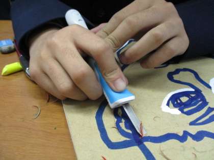 少しずつ彫れるようになってからは、いよいよ顔のふちどりです。ゆっくりていねいに彫り進めています。