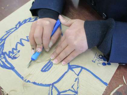 いよいよ、彫刻刀を使って板を掘っていきます。先生から彫刻刀の持ち方、掘り方、彫刻刀を持っていない方の手の位置などについて話を聞き、いよいよ掘っていきました。