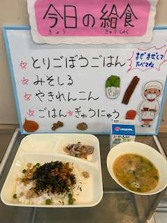 鳥ごぼうご飯は、ご飯に具材をのせた上にきざみのりをかけ、よく混ぜてからいただきます。具材にしっかり味がついていておいしかったです。