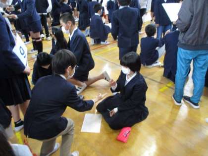 初めに集会で6年生とサイン集めゲームを行い、その後、祝う会を行いました。