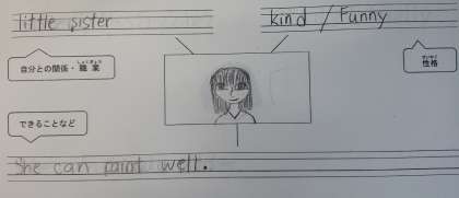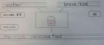家族の紹介では、自分との関係や、性格、その人ができることなどを英語で書く学習をしました。来週仕上げて、プレゼンテーションする予定です。