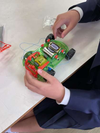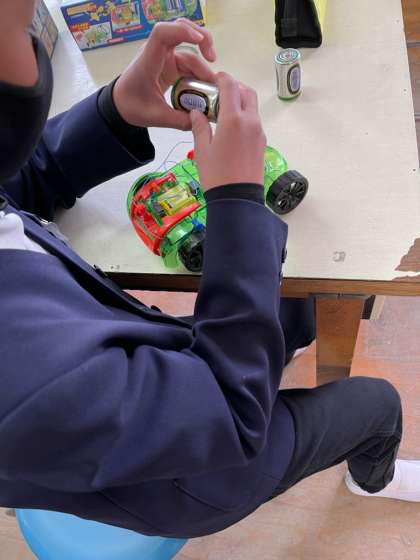 理科の学習で電磁石を使って、モーターをつくり、車づくりをしています。
