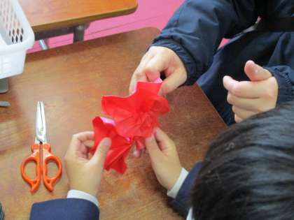 3月は「卒業式」があるので、6年生をお祝いするためにお花紙で花束を作り飾り付けしました。みんな一生懸命に作ってくれました。6年生の子どもたちが喜んでくれると嬉しいですね。