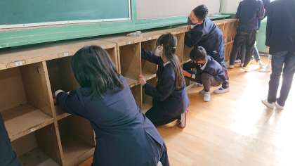 3月23日(火)、教室の大そうじをしました。机といすを全部廊下に出した後、きれいにはいて、床もロッカーも丁寧に拭きました。その他にも、きれいにするところを自分で見つけて、みんなで協力して拭きそうじできました。