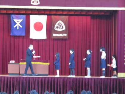 修了式の中で、に〜よん漢字検定と国際平和ポスターで5年生が表彰されました。
