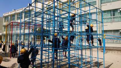 4月12日(月)の対面式を終えて、2〜6年生とお互いに顔合わせをしてから、運動場で遊ぶことができるようになりました。運動場での遊び方で気をつけることを話し、鉄棒、タイヤ、うんてい、ジャングルジムで遊びました。出来島小学校のジャングルジムは、一足上る高さがわりと高めですが、安全に気をつけて遊ぶことができていました。