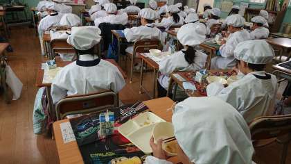 給食は、入学式の次の日から始まっています。重い給食をがんばって運び、配膳の仕方も学んで、静かにおしゃべりをせずに食べています。みんなが食べ終わって「ごちそうさま」をするまでは、おしゃべりをしてはいけないことにしています。ついつい、しゃべってしまう様子が見られますが、しゃべらずに待つ練習をしているところです。
