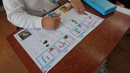 1年生は、ひらがなの学習をがんばっています。今日は「ま」と「て」でした。