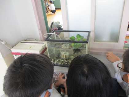 理科の『メダカのたんじょう』の学習で、5年生の各クラスでメダカを飼っています。子どもたちは動く対象に興味津々で、水槽をのぞき込んではメダカの動きを観察しています。