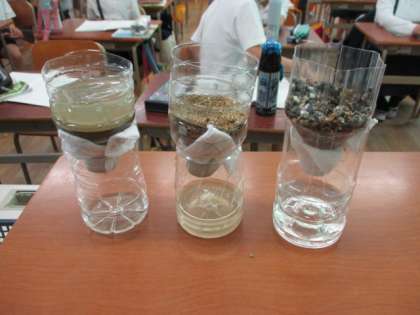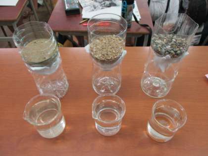 すなの粒の大きさによって水のしみこみ方に違いがあるのか実験をしました。