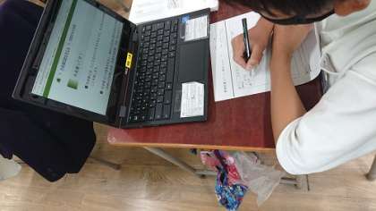 写真は、個人パソコンを使って調べ学習をしているところです。