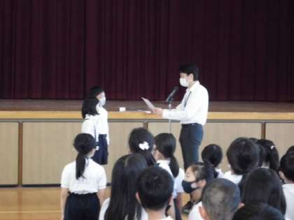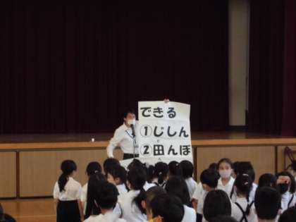 今日の児童朝会での校長先生の話は、創立記念日にちなんだ話でした。