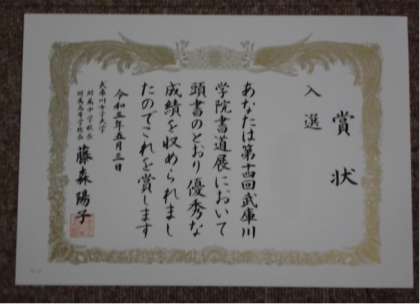 昨年度に応募した第14回武庫川学院書院展にて、今年度5年生の2名が入賞しました。