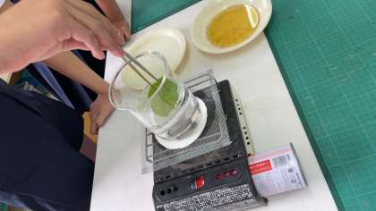 葉っぱを煮沸して、ヨウ素液につけて反応がでるか・・・