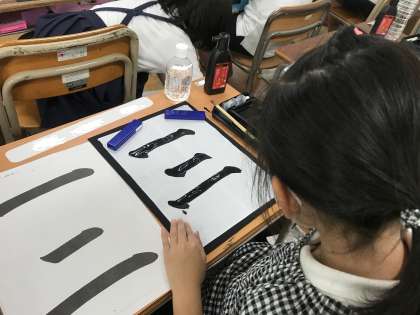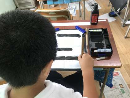 鉛筆とはちがう書き方に戸惑いながらも、頑張って書いていました。