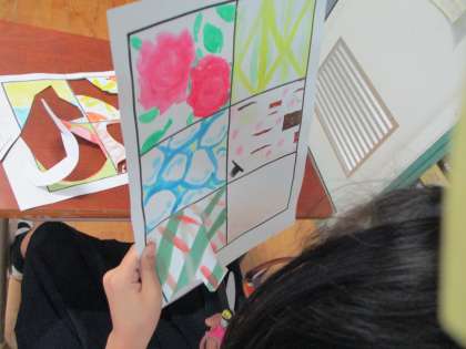 図画工作科の『心のもよう』という単元で、12種類の模様を描きました。次の段階は、それらの模様を切り、画用紙に貼っていく作業です。