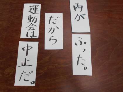 今週の5年生国語では、接続詞を考える学習をしました。文節ごとに区切ったカードを使って、文を並び替えた後、主語・述語・接続詞について考えました。接続詞の使い分けや、2つの文を1つの文にまとめる学習をしました。カードを使うことで、文の組み立てやつながりをよく考えることができていました。