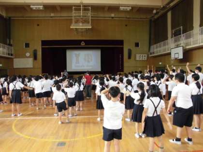 本日の児童集会は人権教育で、英語を教えてくれているヴィアフロレイン先生が、英語の学習と英語での〇☓ゲームをしました。まずは、英語で準備運動をして。