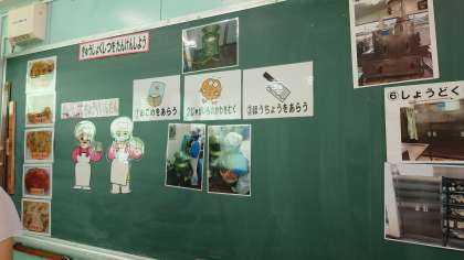 出来島小学校では、二人の給食調理員さんが250名ほどの人数の給食を作ってくださっています。給食室について、給食室の中にある機械や道具などについて教えてもらいました。