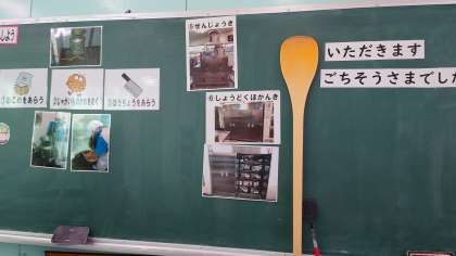 家庭用のしゃもじと給食室で使う道具の大きさの違いを教えてもらって驚いたり、たくさんの人数分の給食をつくるための努力や願いなどを知ったり考えたりしました。