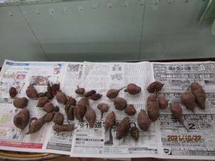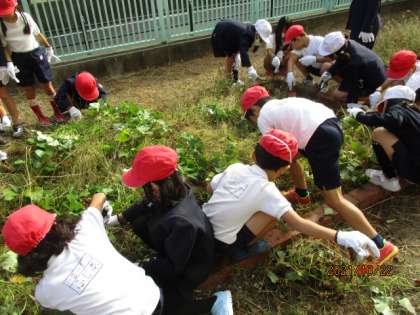 秋に入り、気温が下がってきました。今日は、サツマイモの収穫を行いました。大きいものから、小さいものまで様々でした。土の中から、ミミズやコオロギ等もたくさん出てきました。