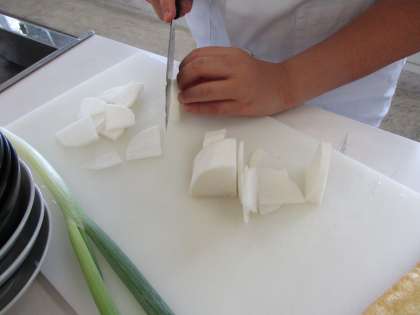 お味噌汁に入れる『実』を切りました。先生から教わった通りの包丁の持ち方や握り方、包丁の置き方や向き、指の添え方や切り方・・・真似をして上手に切ることが出来ました。