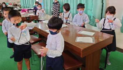 トライアングル・すず・カスタネット・タンブリン・木琴・鉄琴を使って演奏し、1つの曲として演奏します。