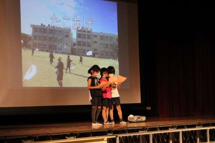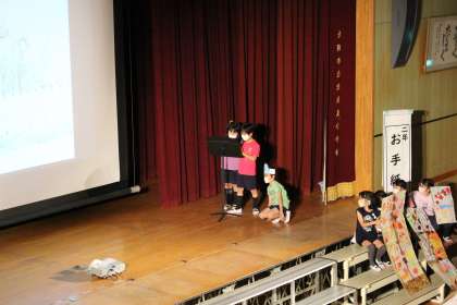 2年生は、合唱「かえるのがっしょう」、劇「お手紙」、最後は音楽に合わせたダンスとともに、1年生の入学式からこれまでを振り返るスライドショーでした。