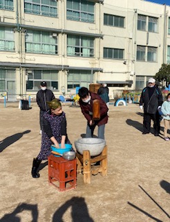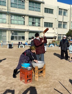 校長先生に続いて、子ども達も餅つきを楽しんだ後、パック入りのおもちをもらって帰りました。