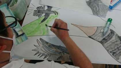図工科では、国語科で学習した物語「大造じいさんとがん」から、最も印象に残った場面を選んで、絵にしました。