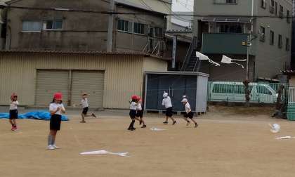 生活科と図画工作科の時間に作成した「ぐにゃぐにゃだこ」を体育の時間を使ってあげました。