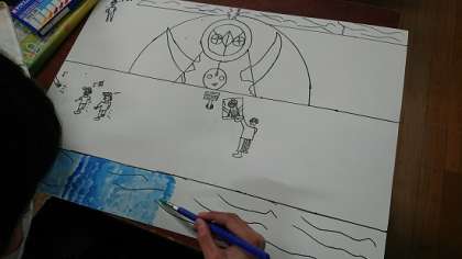 写真は、遠足で、万博記念公園に行った時のことを絵にしています。