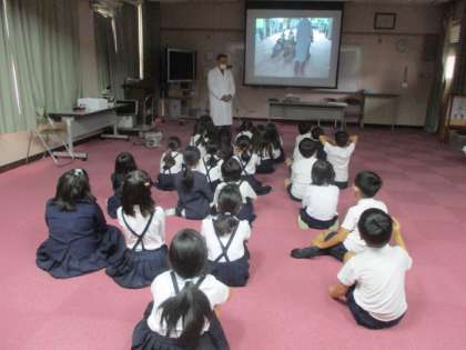 子どもたちは初めてのホタルに興味津々で,しっかりと話を聞いていました。「どうしてホタルは赤い光が見えないのかな?」「本当に光るのかな?」と疑問をたくさんもちながら学習できました。