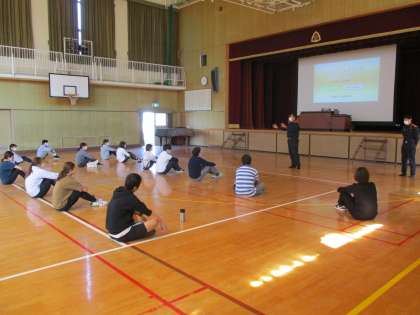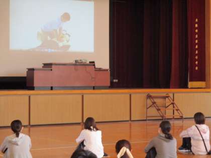 本日、プール学習のために救急救命講習会を行いました。消防署の方に来ていただき、お話を聞いたり、DVDを見たりして心肺蘇生の方法を教えていただきました。