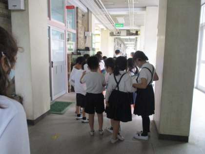 グループ4人か5人で、学校内を周りました。