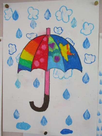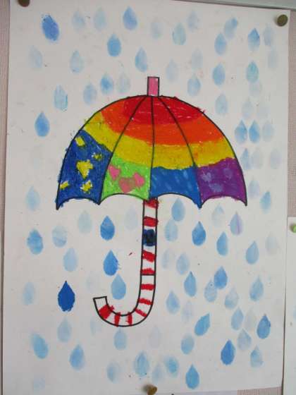 雨のしずくは、画用紙にしずくの型をくりぬき、パスのぼかしの方法を使って書きました!