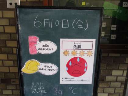 暑さ指数「危険」が出ています。熱中症には十分に注意をしましょう!帽子を忘れている児童がいます。朝しっかり被って登校できるように、ご家庭での声掛けをお願いします。また、水筒、帽子、汗拭きタオルの準備もお願いします。