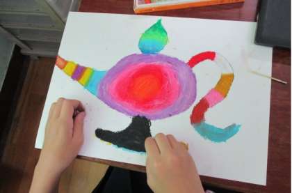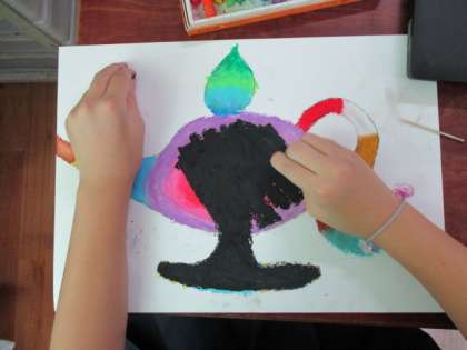 パスでカラフルにゴシゴシ塗りをし,その上からなんと黒色のパスでさらにゴシゴシ塗りをしてしまいます!この後にどんな作品が出来上がるかは,お楽しみです☆