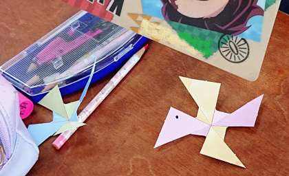 教科書の紙教材「ふきこま」は円ではありませんが、下敷きであおいで風で回してみると円に見えます。