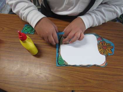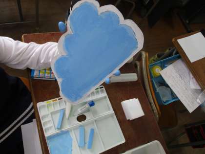 5年生の図工では、電動のこぎりで切った板に絵具で色をつけています。