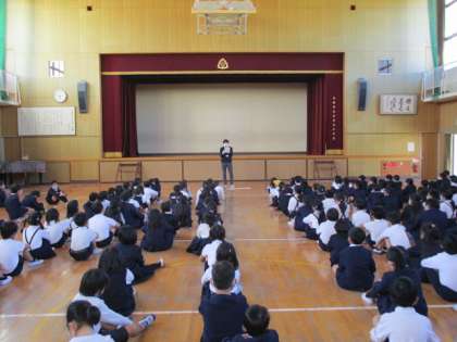 今日の児童朝会の校長先生からのお話は、日本の小学校から外国の小学校へ転校することになった子どもたちの話です。