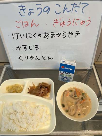 今日の給食、「かすじる」は、たくさんの具材が入っていて、からだもポカポカとあたたまりました。「けいにくのあまからやき」は、とってもやわらかくてジューシーでした。食べやすい大きさにしていただき、調理員さん、ありがとうございました。