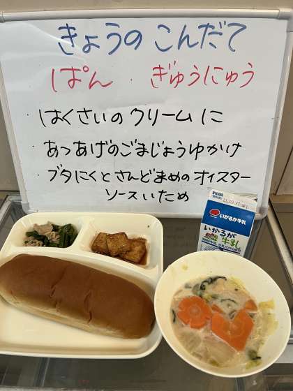 今日の給食は、「はくさいのクリームに」「あつあげのごまじょうゆかけ」「ぶたにくとさんどまめのオイスターソースいため」でした。