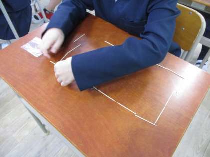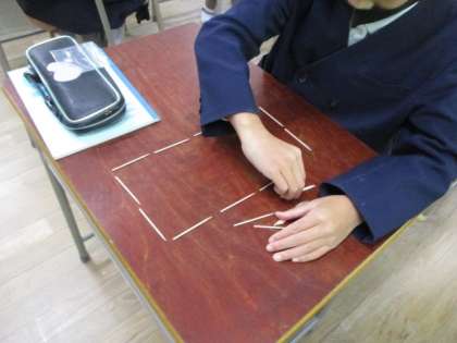 最初は子どもたちも聞きなれない言葉にとまどっていましたが「18本の爪楊枝を全部使って様々な長方形を作ろう」という課題に取り組むうちに、一定のルールがあることに気付いたようです。