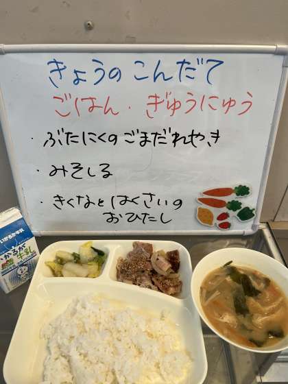今日は、「ぶたにくのごまだれやき」「みそしる」「きくなとはくさいのおひたし」でした。「ぶたにぐのごまだれやき」は、ほどよく玉ねぎと混ざり合い、ごまの香ばしいかおりがしましたね。