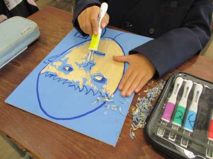 図画工作科で「ほってすって見つけて」という単元で、初めて彫刻刀を使った版画に挑戦しました。先生に彫刻刀の持ち方を教えてもらうところから始まり、怪我をしないように何度も何度も先生に手を添えられながら作業を進めていきました。丁寧に丁寧に一彫りずつ作業を行った後は刷る作業に移りました。刷った出来上がりを見て皆、大満足(*>▽<*)