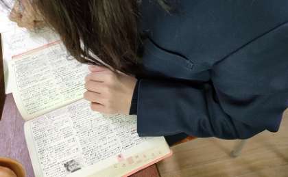 今は、お手本の文章を聞いたり、分からない言葉の意味調べをしたりして、文の内容を確認しています。
