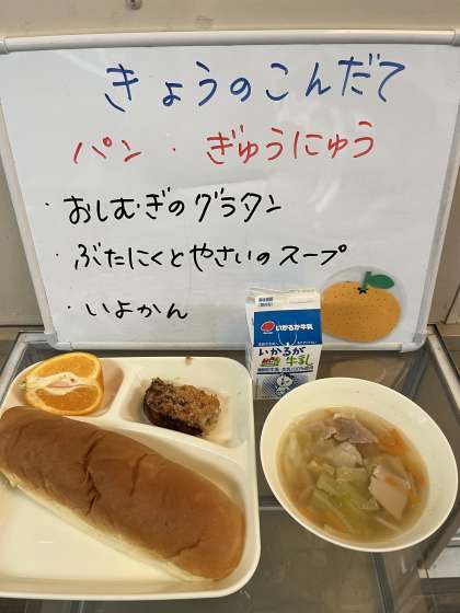給食では、「おしむぎのスープ」もあります。