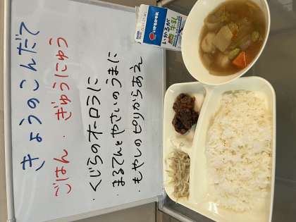 「オーロラ煮」っていうのは、油であげた「くじら」に「みそ」とケチャップを混ぜて作ったソースをからめたお料理です。