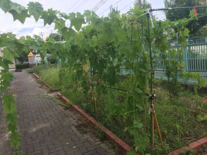 4年生の学習園では、ヒョウタンとヘチマがすくすくと育って、固定用に縛っていたヒモや地面いっぱいにつたを伸ばしている姿には驚き、2学期になって、子どもたちが自分たちで植えたヒョウタンとヘチマの成長に驚く姿を見るのが楽しみになりました。